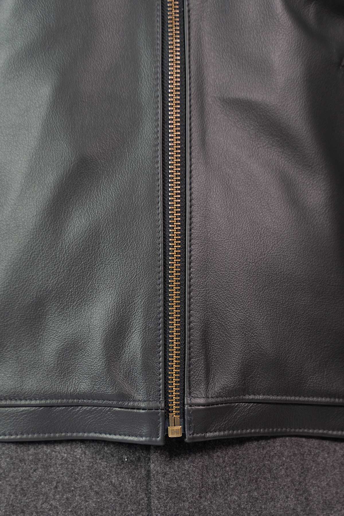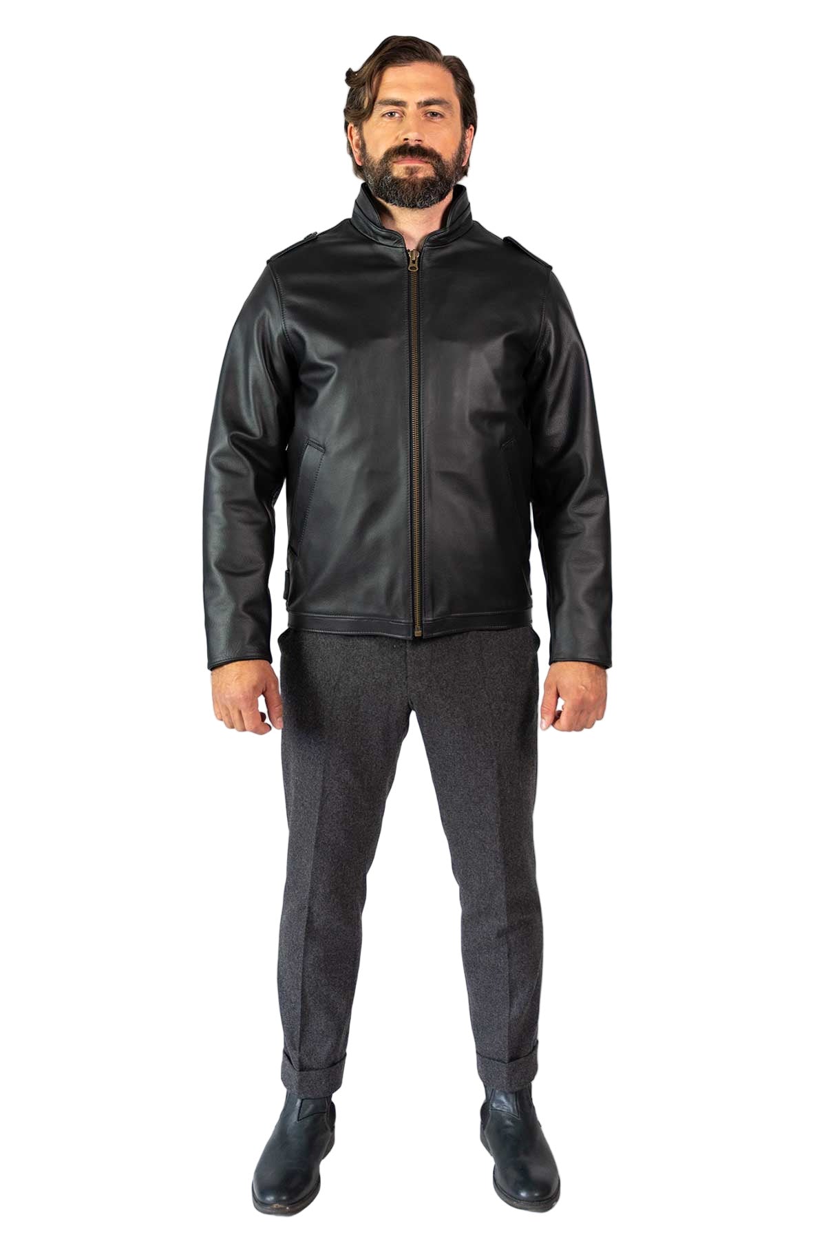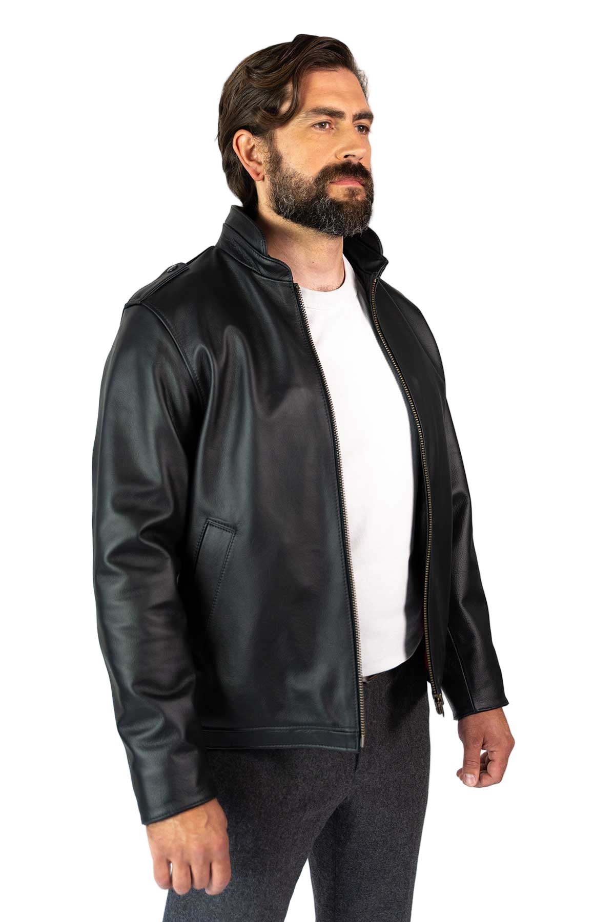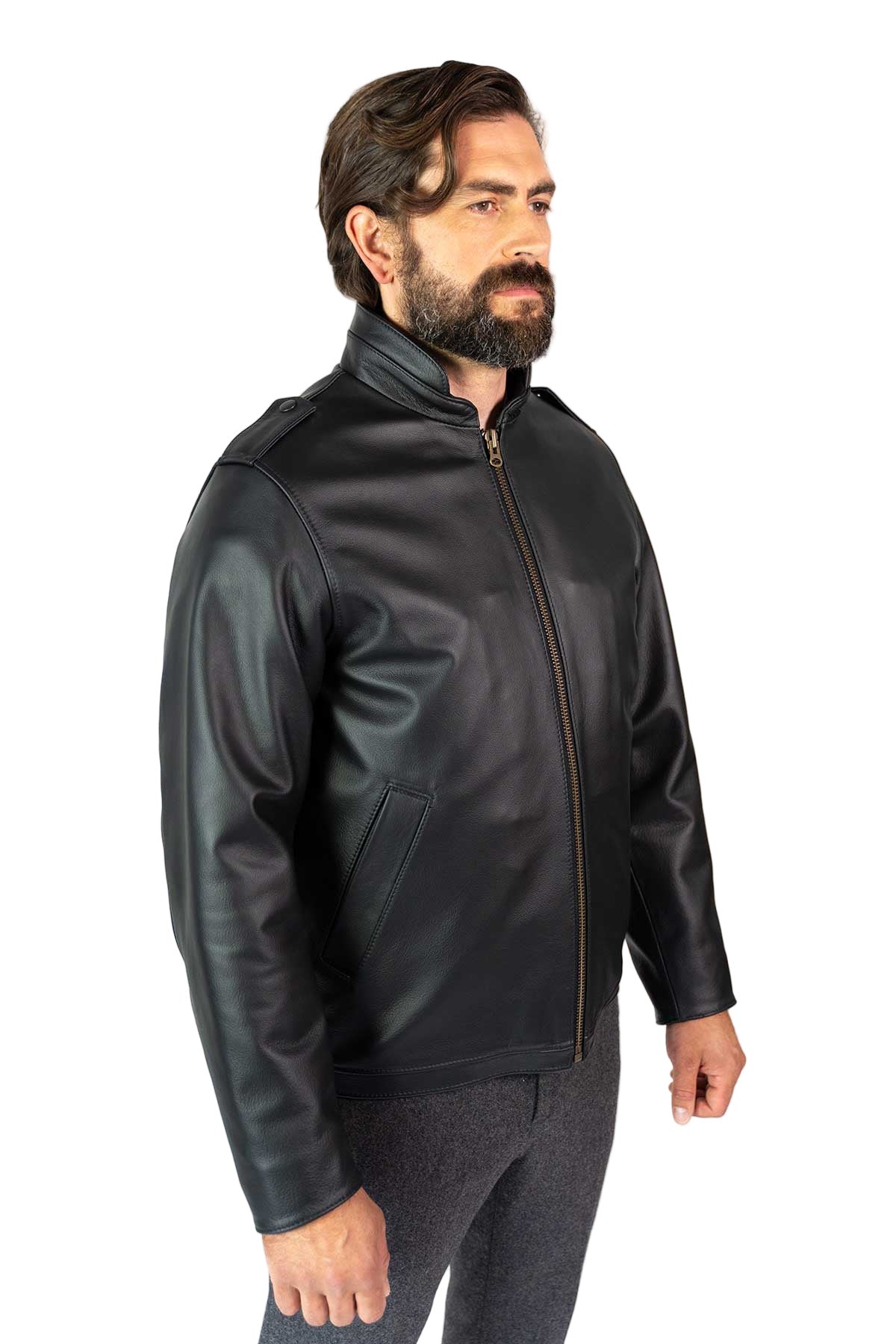 Crafted from supple black cowhide and finished with a striking red cotton drill lining, it features a refined upright collar, heavy-duty brass zip, and a unique woven label confirming its official provenance. A true essential!