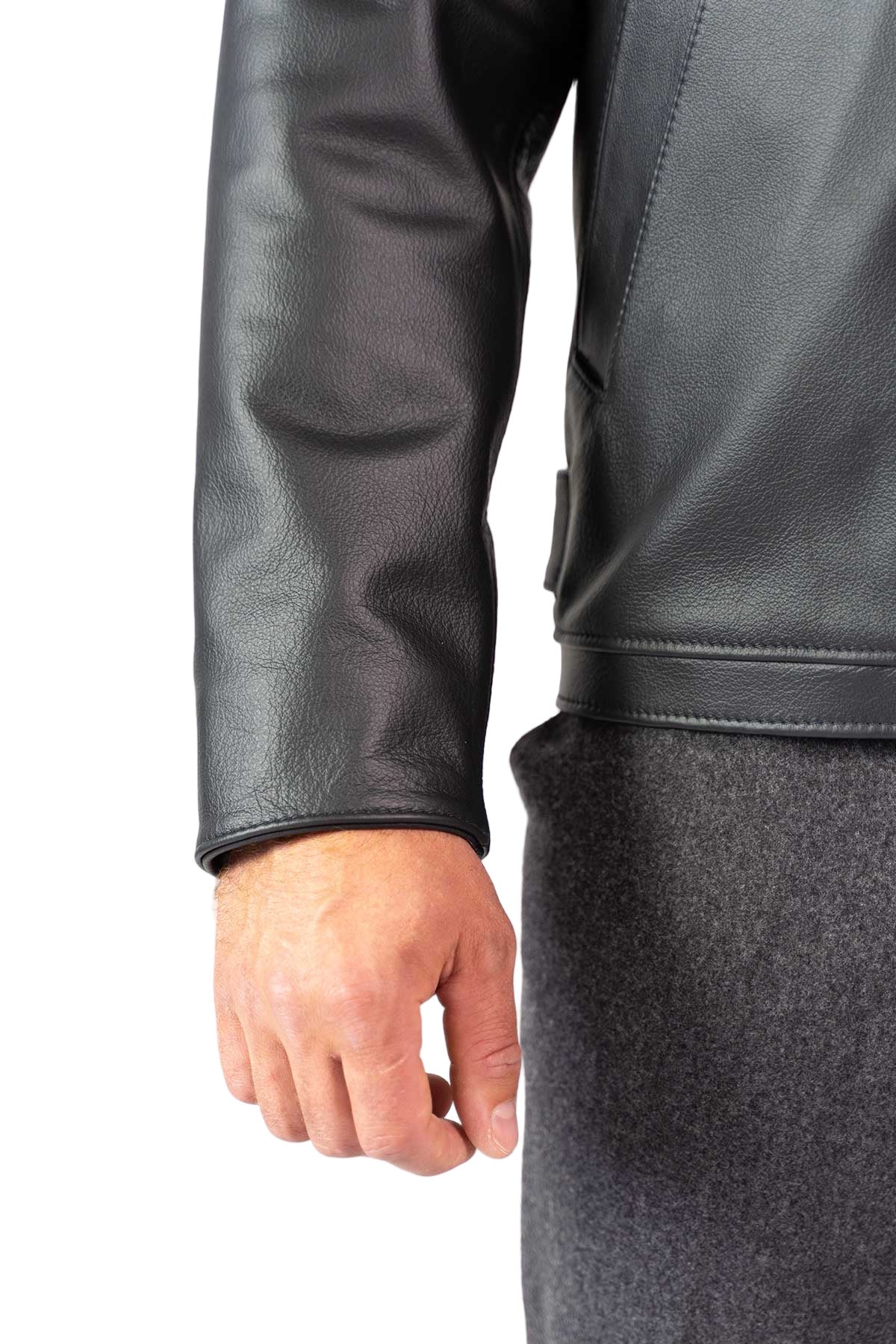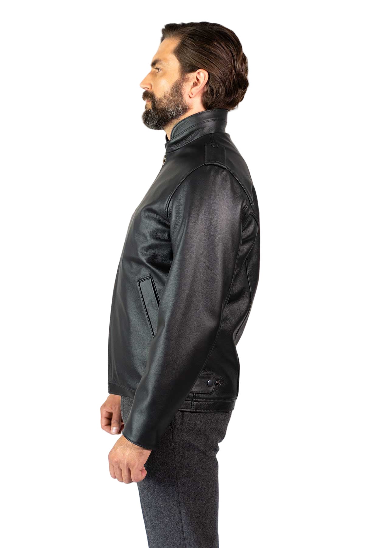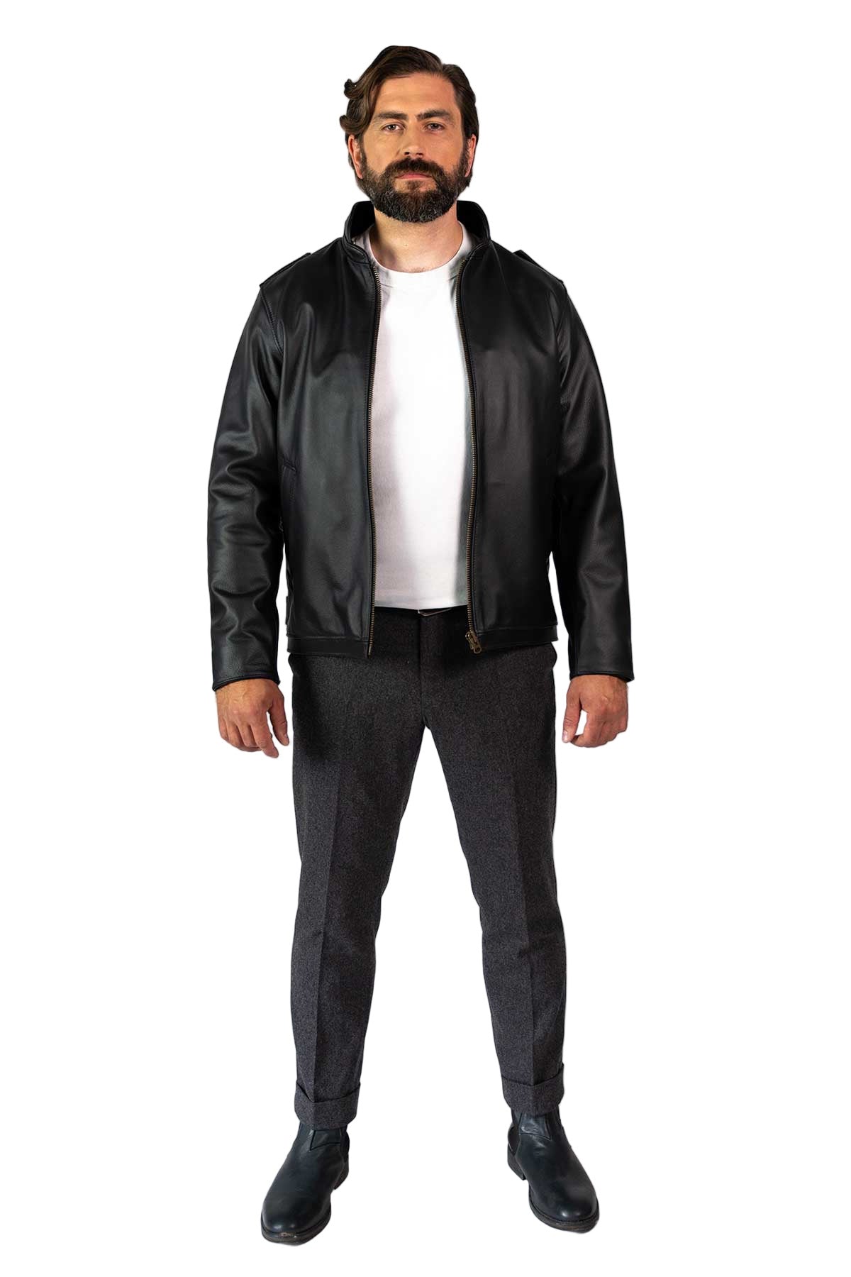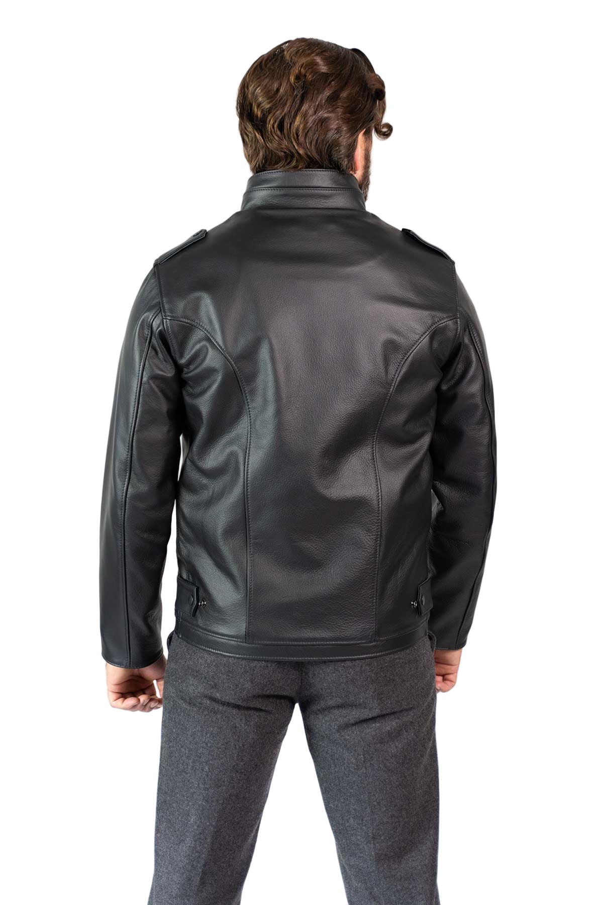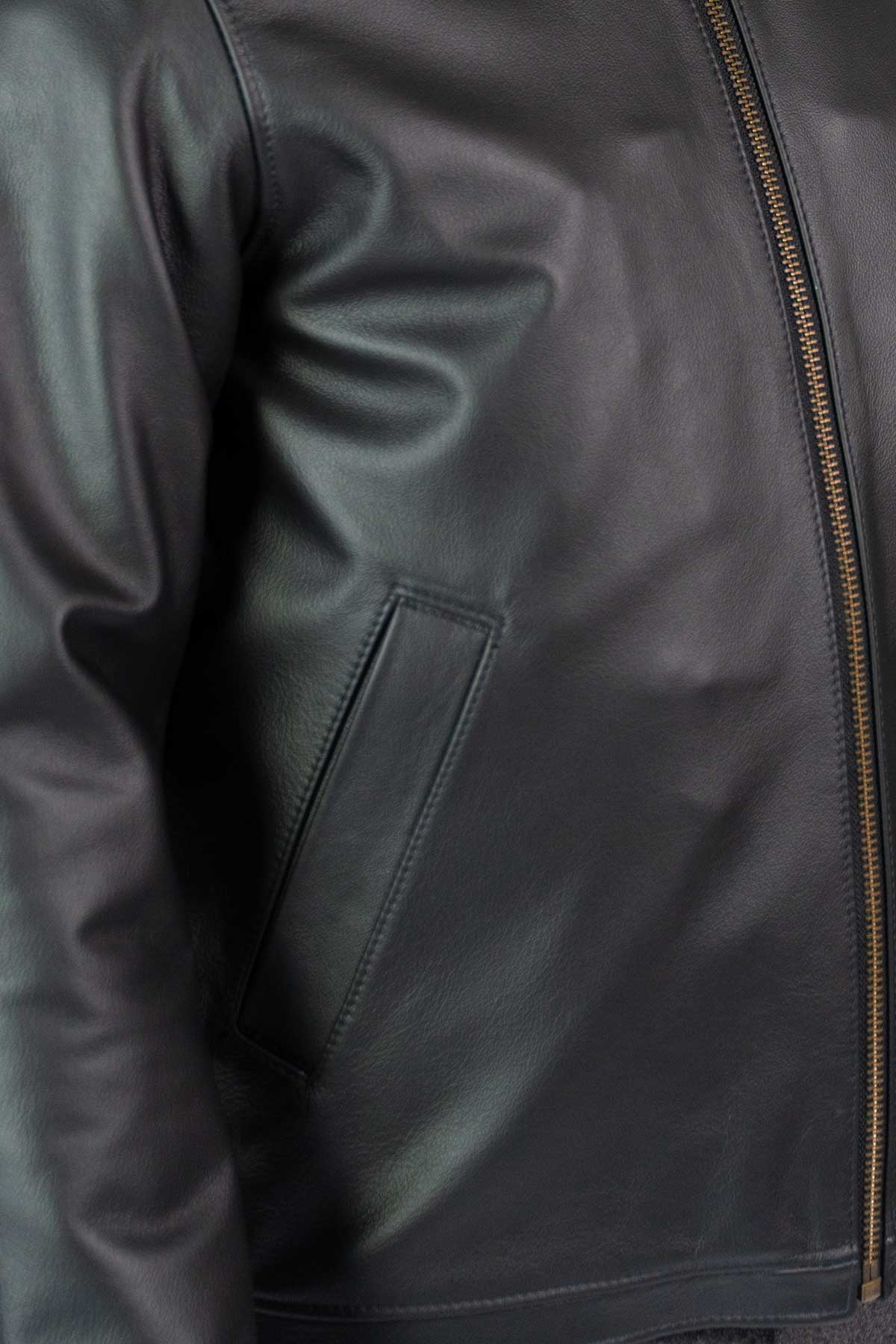 Crafted from supple black cowhide and finished with a striking red cotton drill lining, it features a refined upright collar, heavy-duty brass zip, and a unique woven label confirming its official provenance. A true essential!