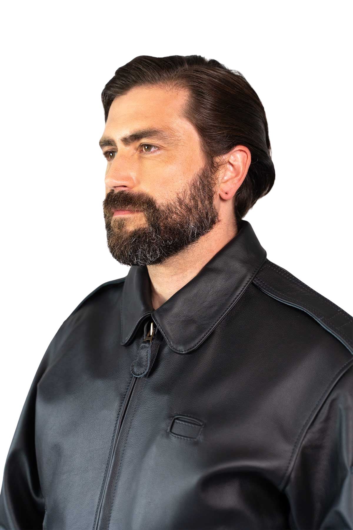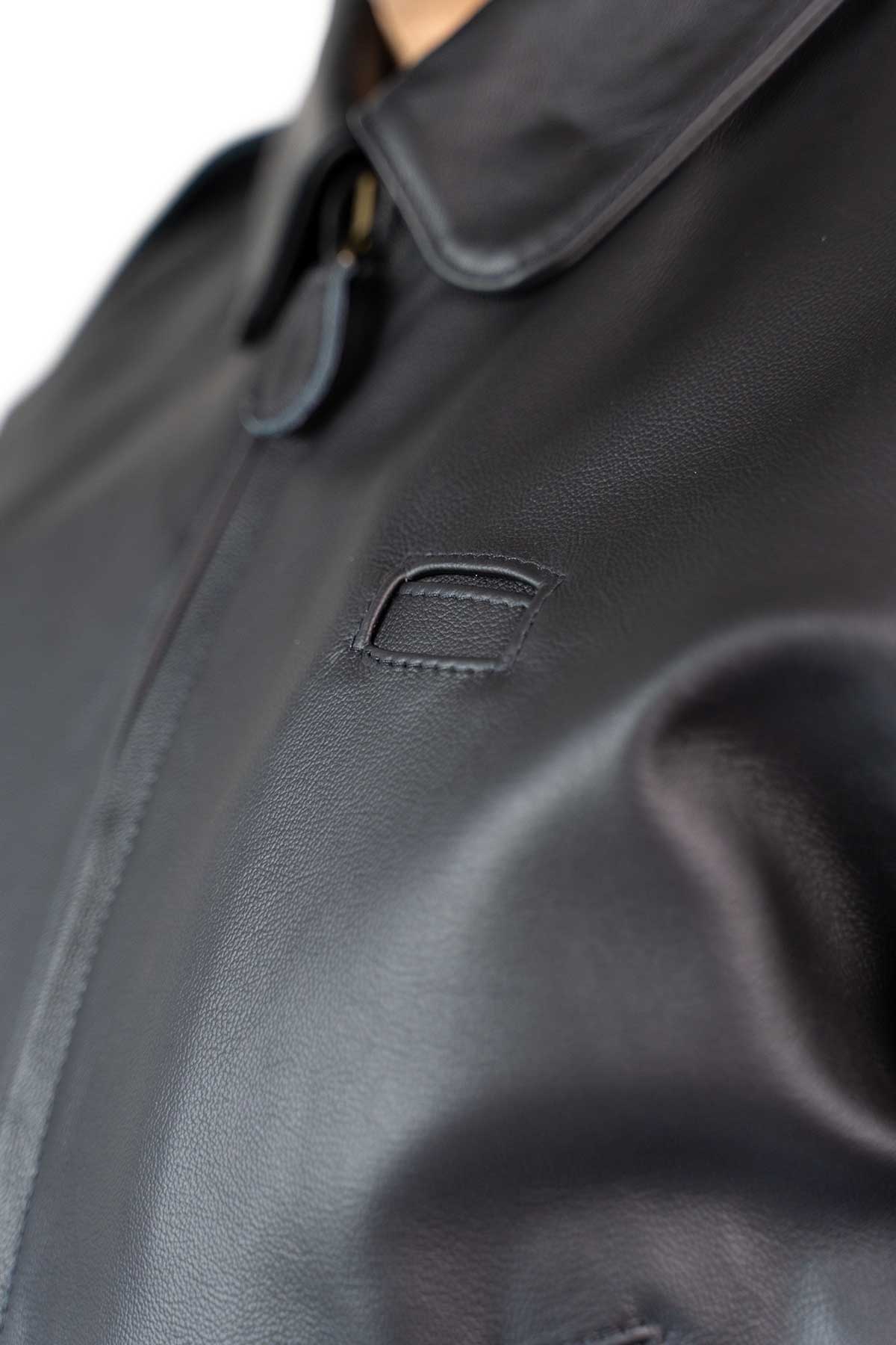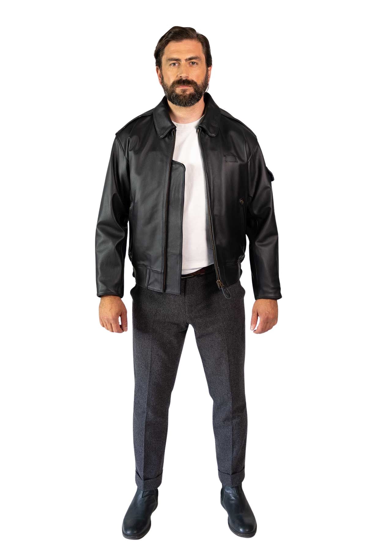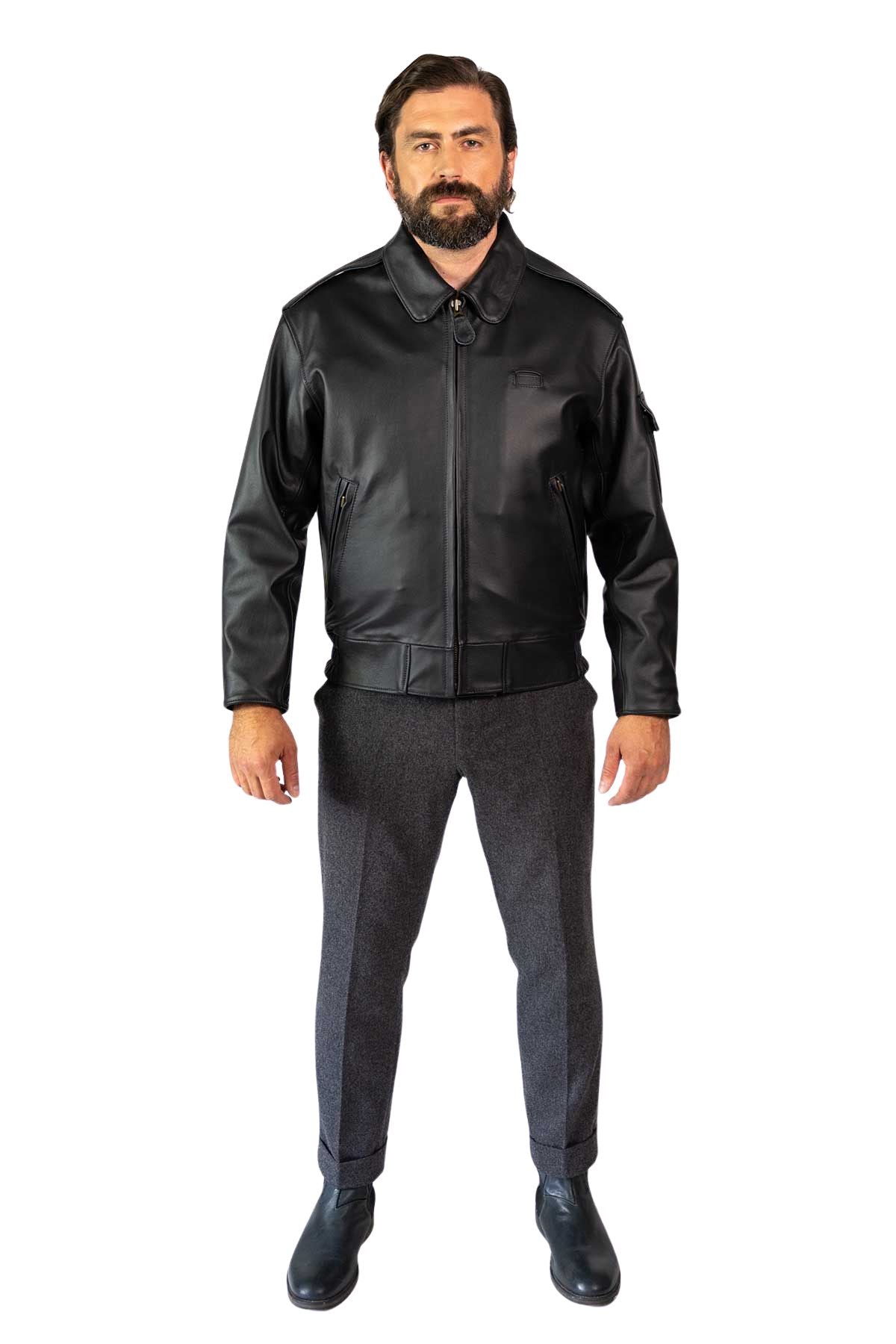 Made from premium black cowhide and lined in matching black cotton drill, it’s built for all-day wear—with practical ventilation, secure pockets, and discreet storm cuffs. A timeless tribute that oozes everyday appeal.